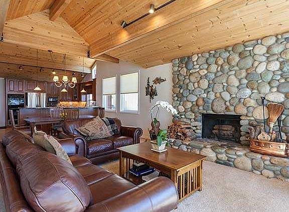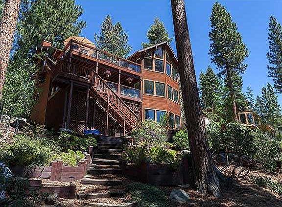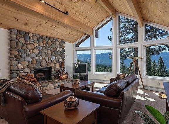 Warm mountain style home thoughtfully designed to enjoy the views of the lake & the Sierras. Flooded w/natural light, two stone fireplaces flank the main living spaces & join a large private lake view deck for delightful summer entertaining. The handsome kitchen is generous in size w/slab granite counters & stainless steel appliances - the focal point for effortless entertaining. Master bedroom suite is a quiet oasis w/ private spa deck. There are 2 guest bedrooms + an office & second garage.