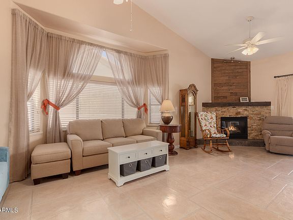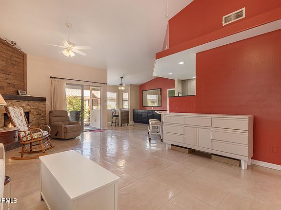 Beautiful townhome in the Adult Community of Apache Wells 2! 2BR 2BA +Den 2CG. The floor plan is a spacious design with vaulted ceilings and decorative niches overhead. Gorgeous stamped concrete flooring runs throughout. The living room features a bay window and a beautiful cozy fireplace. The kitchen offers recessed lighting, ample counterspace with granite countertops, wood cabinetry, a set of display cabinet doors, travertine backsplash, white appliances, gas stove, walk-in pantry and a breakfast bar offset by the dining area. The main bedroom includes a bay window, walk-in closet & a private bathroom with dual sinks, extended counterspace with quartz countertops, makeup vanity and walk-in shower with glass enclosure and luxury plank vinyl floors. The 2nd bedroom also has a bay window. The den is spacious great for any use. Out back features a covered patio w/ an extended patio and a greenbelt. Enjoy all the amenities of Apache Wells; Sparkling pool and spa, tennis courts, shuffleboard courts, recreation hall, billiards room, card room, computer room, pet, park and themed events.