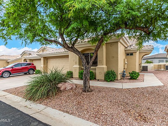 Welcome to this 2-main bedroom townhome in Apache Wells! The interior showcases vaulted ceilings, a soothing palette, half-moon windows, blinds, and plush carpeting in all the right places. Large family room for entertaining. The kitchen is equipped with wood cabinetry, efficient recessed lighting, stainless steel appliances, a two-tier peninsula with a breakfast bar, and a lovely breakfast room. Both main bedrooms are split and include a walk-in closet and its own bathroom. Outside, the covered patio offers a private oasis for evening relaxation. This gated Community boasts a swimming pool, a relaxing spa, BBQ areas, and a lush greenbelt. Located near golf courses, restaurants, and shopping options. See this gem today!