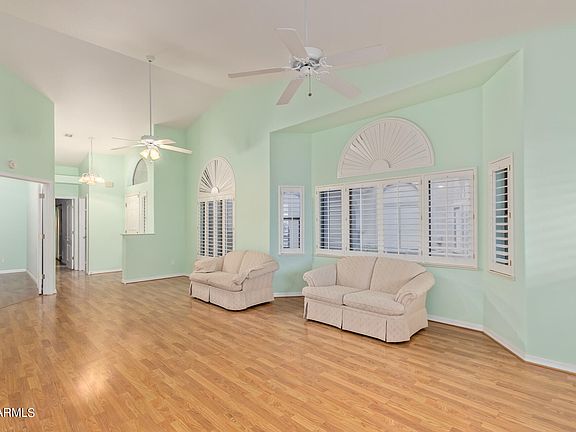 Gorgeous Home in Apache Wells Secure 55+ Gated Community For Sale! This Beautiful C Model home is airy and bright, greeting you with vaulted ceilings and plenty of windows featuring upgraded plantation shutters to let tons of light in. It has hardwood flooring throughout, with a layout that's both spacious and open. The eat-in kitchen with bay window features stainless steel appliances, breakfast bar, and tons of cabinetry for all your storage needs. The Primary Bedroom makes the most of the vaulted ceiling as well, with another bay window, and has plenty of room for larger furniture. The Primary Bathroom has dual sinks, an accessible shower, and a big walk-in closet. The Secondary Bedroom is expansive, with access to the Secondary Bathroom as well. There's even a huge den that would be the perfect office, at-home gym, craft room, guest bedroom, you name it! If that's not all, there's inside laundry with full size units, 2 Car Garage with Epoxy flooring, water treatment to the home, and you won't have to worry about the new roof or newer AC! Outside, enjoy our beautiful weather under the shaded patio or relax in the serene backyard with immaculate landscaping. There's 5 Bay Windows in total, adding to the sqftage from the standard C Model. Apache Wells 2 has tons of community amenities, from the gorgeous clubhouse to the heated pool and spa. Minutes away from Shopping, Dining, Golf, Entertainment, Hospitals, and just a short drive down the 202 to Sky Harbor. Welcome home!