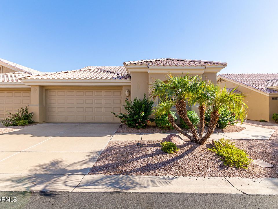 Welcome home to your meticulously maintained townhouse in much sought-after gated community of Apache Wells II. Home features a spacious open floor plan with an elegant living room and vaulted ceilings, no carpet, decorative niches overhead, bay windows in the master and the breakfast nook, ceiling fans, two master suites with walk-in-closets. Master bathrooms has dual sinks. Kitchen offers recessed lighting, breakfast bar, ample cabinets and counter spaces. All appliances are included. Ample space in the extended 2 car garage with plenty of storage. Carefree living, as HOA takes care of all exterior maintenance of the home. Nice covered patio overlooks a private, fenced backyard. Conveniently located near shopping, golf courses and entertainment.