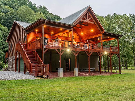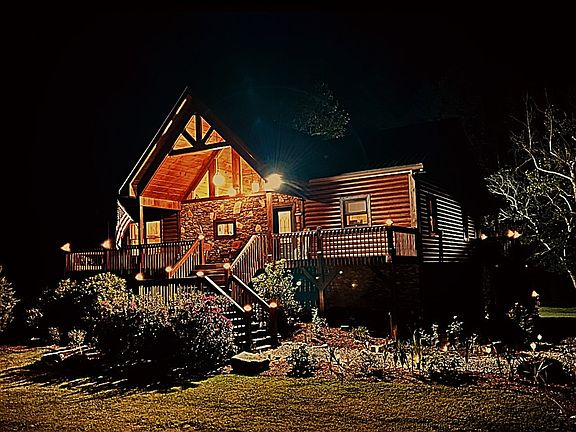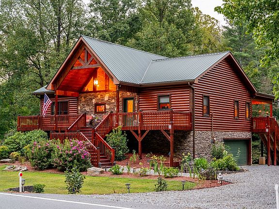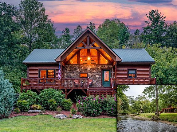 Your search for riverfront property ends here. Discover 4.02 acres of tranquility w/600 feet of RIVER ACCESS, just minutes from Murphy and Andrews. This homesteader's paradise features a fruit tree orchard, a garden w/established compost bin, and even a chicken coop with 5 chickens & 1 rooster which all conveys with the property. Enjoy the luxury of a 1,536-sqft 2-BD, 2.5-BA cabin that blends rustic charm with modern amenities. Relax on the expansive 16x48 covered deck in the hot tub, overlooking the manicured backyard and the rushing Valley River. The kitchen is a chef's dream with a profile cooktop stove, double ovens & microwave, live-edge granite countertops, hidden appliance counter, custom cabinetry, wet bar, wine rack, and high-end appliances. Just off the kitchen, convenient access to the W/D is located in the oversized pantry. An open living/dining area includes a beautiful moose antler light fixture that pairs with the rustic style of stone gas fireplace. A split floorplan boasts of two large bedrooms w/luxurious ensuites of stone and tile elegance. Lots of extra storage throughout and a bonus room for an office or gym and even a secret loft area which can be accessed by ladder. Don't miss the unique Italian petrified sink basin in the guest powder room. The full unfinished basement offers worktables, and a double-car attached garage. Additional storage is available in a 2-bay metal building suitable for RVs or boats located across the street. This luxurious cabin is a rare gem combining rustic elegance and modern comfort. Schedule your private tour today; this property will go fast! **Just for fun, search for the 3 moose etchings in the kitchen while touring the home.