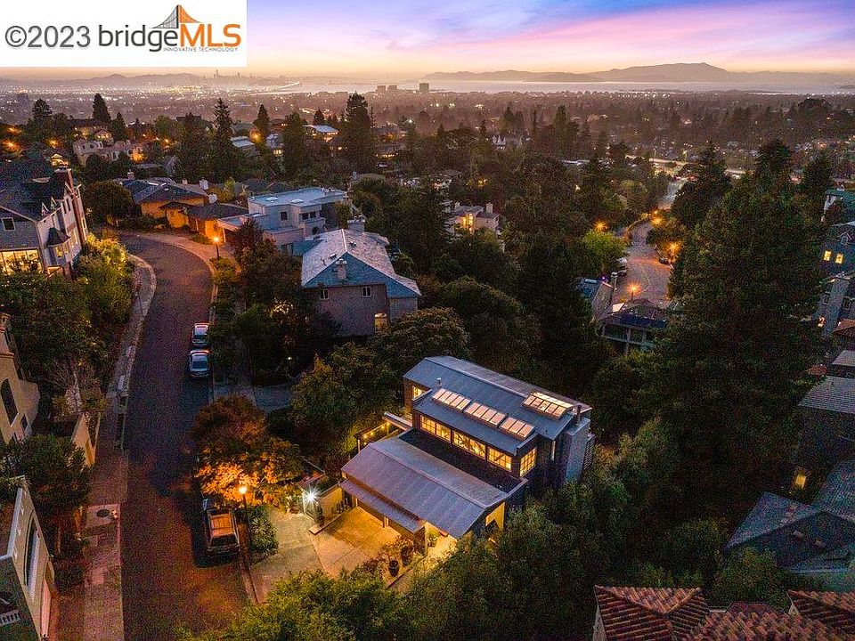 This luminous contemporary home is a delight to the senses. The soaring ceiling brings your eye up to the massive skylights and structural beams, while a sparkling Mt.Tam view draws your gaze out and over the Bay. Warm wooden windows mix with exposed steel for a unique aesthetic that is anything but pedestrian. High-end appliances, ample counter space, and leafy vistas make the open kitchen a place to create and gather. Enjoy outdoor dining on the adjacent deck, nestled above the side garden. Perched over the great room is a large loft, ideal for an office or media room. Descend a light-filled staircase to three bedrooms, three bathrooms and laundry. The primary suite offers a sitting area, a huge custom closet, and a spacious bathroom with a soaking tub. A second suite boasts a private covered deck and space for both a work and lounge area. The garden level presents the icing on the cake with a fully equipped, one-bedroom ADU. Rarely do you find Upper Rockridge homes with such expansive and private gardens. Large evergreen trees and hedges encircle the yard with flowering Crape Myrtle and mature lemon trees bringing color to the space. The stately trellis creates a picturesque lounge area to relax or entertain. Treat yourself to a visit to 5831 Buena Vista Avenue!
