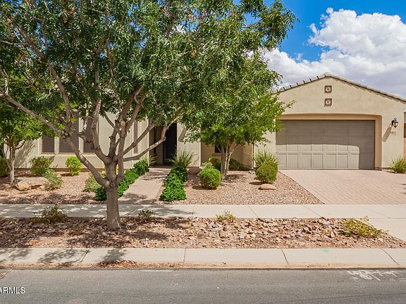 Welcome to this stunning 2-bedroom + den, 2.5-bath home offering 2,314 sq. ft. of thoughtfully designed living space in the highly desirable Encore at Eastmark community. Step inside to find a spacious, split floor plan with wood-look tile flooring in all the right places. The open-concept kitchen and great room is a true entertainer's delight, featuring granite countertops, stainless steel appliances, dual ovens, a large island with seating, tiled backsplash, walk-in pantry, and soft water system. The primary suite provides a private retreat, while the versatile den offers flexibility for an office, hobby room, or guest space. Enjoy outdoor living year-round with a covered patio overlooking a beautifully landscaped private backyard with citrus trees and a sparkling solar-heated pool... The 3-car garage with cabinets ensures ample storage and convenience. Additional highlights include a gas water heater and charming shuttered exterior.