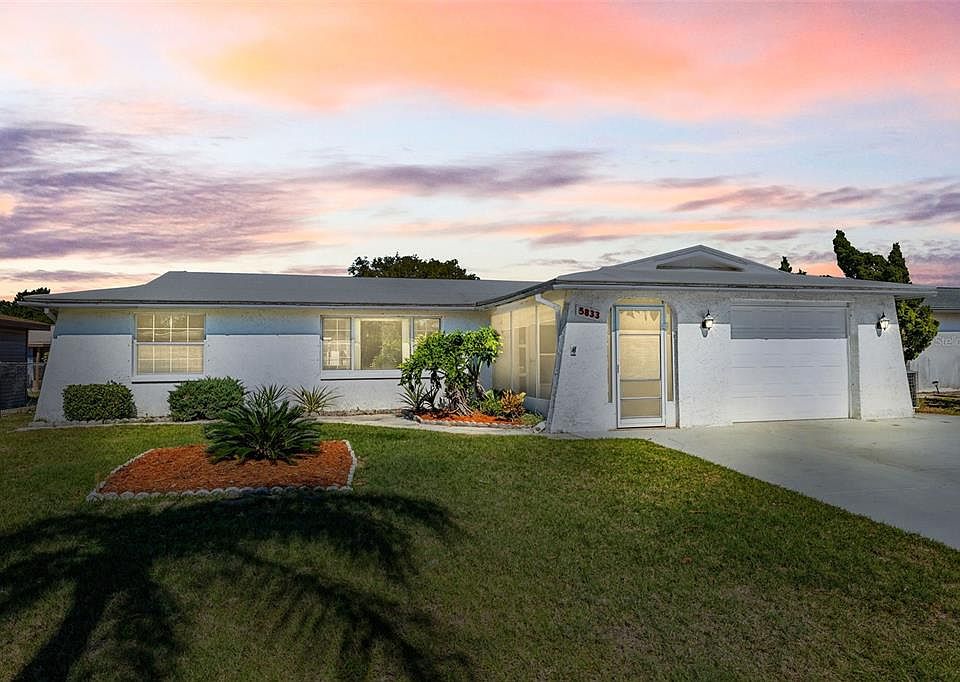 Step into the epitome of comfort and convenience in the heart of vibrant New Port Richey! This spacious, well-maintained residence invites you with a nicely landscaped yard and an expansive oversized driveway with room for three cars. Inside, you can find a thoughtfully designed split floor plan offering privacy and relaxation. The primary bedroom retreat on one side boasts a newer full bathroom and walk-in cedar closet. In comparison, two additional bedrooms with cedar closets and another newer bathroom reside on the opposite side for optimal privacy. The spacious living room seamlessly connects to the dining area and the expansive family room in the rear of the home, creating the perfect layout for entertaining. The well-equipped kitchen with stainless appliances and ample pantry space ensures you're ready for any gathering. A large, versatile bonus room is ideal for an office or hobby room. The garage features an oversized one-car space with integrated laundry facilities and ample storage. Updates include newer insulated and tinted impact-rated windows with hurricane shutters, a new roof in 2014, a new electrical panel in 2021, a new water heater in 2021, and a newer water softener system. This wonderful home is priced to sell; seize this opportunity and make this your forever home!