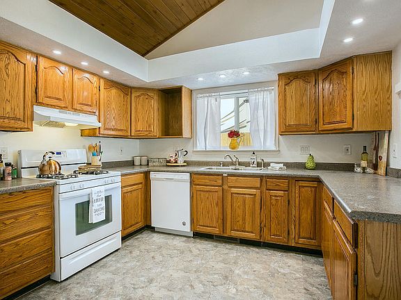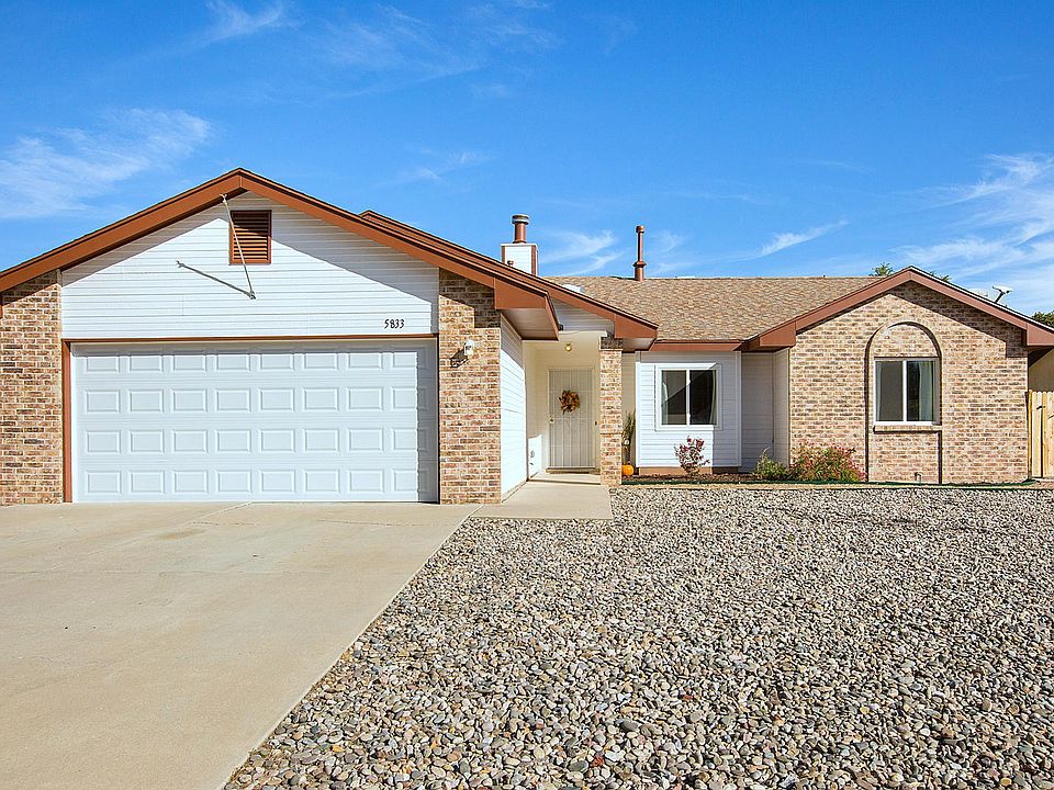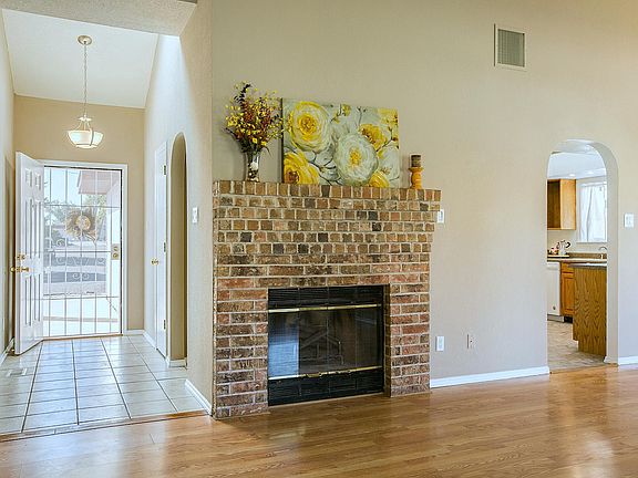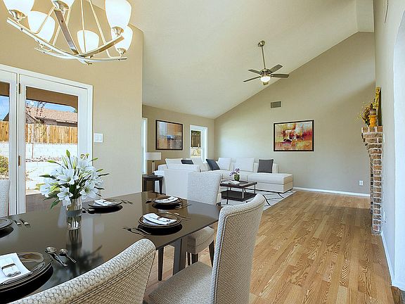 Updated and Move In Ready! No HOA, Large Lot and Pitched Roof. This home is as nice as the photos! 3 Bedrooms, 2 full baths, Updated owner's bath, fresh paint, updated flooring, soaring wood ceilings in kitchen and raised ceilings through-out. Cozy Fireplace, arches, updated lighting, fans and recessed lighting. Fully landscaped front and back includes Green grass! No HOA so bring the RV. Easy access to the back yard if needed. Extra-large .22 acres lot, covered back porch and some views of the Sandia Mountains. 2 car garage with new door. You better move fast because this won't last.
