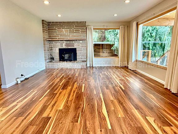 Enjoy elevated North Idaho living in this beautifully refined lakeview home offering a 2-bed/1-bath main residence plus a completely finished 1-bed/1-bath guest suite with its own kitchenette. Thoughtfully renovated throughout, this property blends rich natural finishes with upscale modern touches. The main living area features true hardwood flooring, recessed lighting, and oversized picture windows that frame captivating views of Lake Coeur d'Alene. A wood-burning fireplace with stacked-stone surround adds warmth and character. The gourmet kitchen is appointed with live-edge granite countertops, a large center island, stainless steel appliances, full tile backsplash and pendant lighting all perfectly positioned to capture the lake view through the kitchen windows and French doors. The dining area sits just off the kitchen and enjoys wrap-around windows overlooking the water and backyard garden area. Step outside to a full-length cedar deck with cable railing for unobstructed views, perfect for relaxing or entertaining. The primary bedrooms are spacious and updated with natural light and new carpet. Downstairs, the guest suite includes luxury vinyl plank flooring, butcher-block kitchenette, modern fixtures and a stylish full bathroom ideal for guests, in-laws or extended stays. Additional amenities include a separate laundry room with custom built-in shelving, fenced garden space, and private wooded surroundings. Located minutes to the lake and only a quick drive back into town, this home offers both convenience and a true elevated retreat.