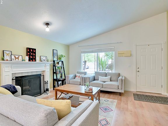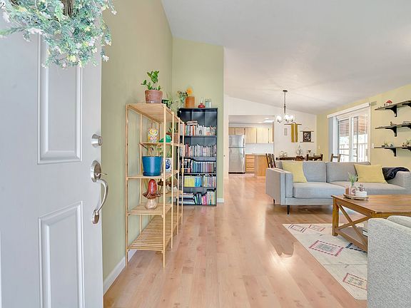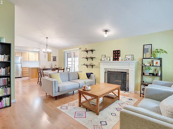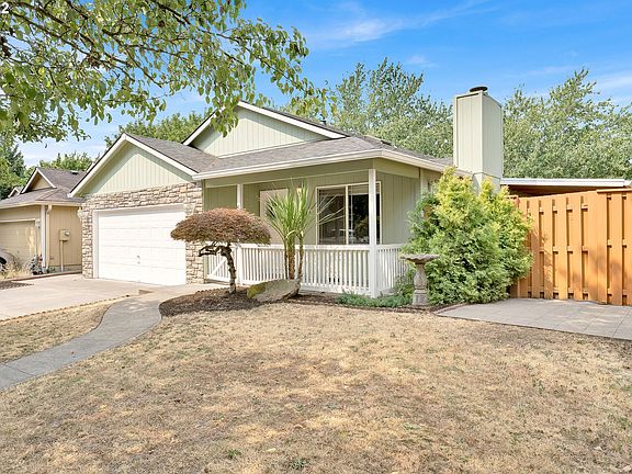 Enjoy easy living on the front porch of this sweet and sunny ranch home on a quiet cul-de-sac! The open living and dining rooms with vaulted ceilings lead out to a covered deck perfect for entertaining. The bright updated kitchen features granite tiles, sunny skylight and a large pantry. Spacious floorplan includes a primary suite, and a laundry room and two car garage. This tidy home has been lovingly kept over the years and features fresh paint, a newer roof and mature landscaping. [Home Energy Score = 7. HES Report at https://rpt.greenbuildingregistry.com/hes/OR10046201]