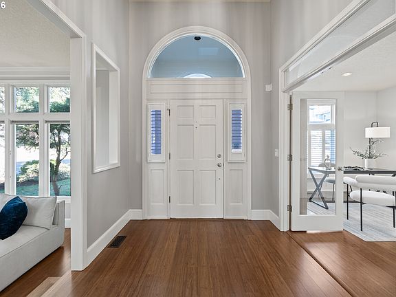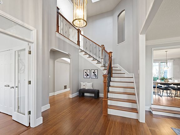 Located on a quiet corner lot in Lake Oswego's coveted Westlake neighborhood, this beautifully maintained home offers a perfect blend of space, style, and natural serenity. Upon entering, soaring ceilings and a grand wrought iron staircase lead into a flexible floor plan defined by low-maintenance engineered bamboo flooring and abundant natural light. The main level is designed for both productivity and gathering, featuring a bright home office and a gourmet kitchen equipped with granite countertops, stainless steel appliances, a center island with a gas cooktop, and a dining nook. This heart of the home flows seamlessly into the family room with a cozy gas fireplace and out to the expansive covered deck. Outside, a private outdoor space includes a covered deck and a concrete patio, overlooking mature landscaping and a tranquil creek just beyond the fence. Upstairs, the primary suite serves as a true retreat, featuring French doors and a charming bay window reading nook. The ensuite bath offers a jetted tub, a walk-in rain shower, and a spacious walk-in closet. A large bonus room provides flexibility, while an oversized three-car garage with built-in cabinetry ensures ample storage for vehicles and gear. With top-rated schools and Westlake Park nearby, this home delivers an exceptional lifestyle in one of Lake Oswego's most cherished communities.