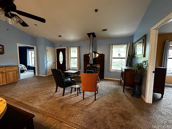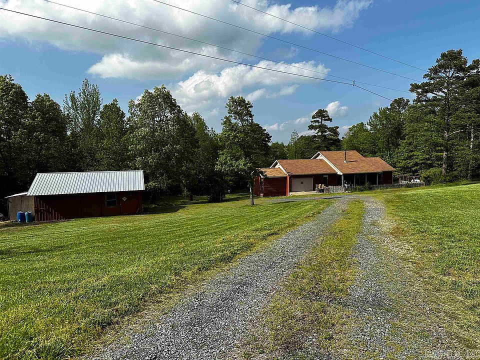 Escape to your own private oasis on this 25 +/- acre parcel nestled in the picturesque Ozark Mountains. Located on a paved county road, a short distance from Historic Leslie Arkansas, is this gem of a property that was established to be a self-sustaining homestead. Some of the homestead features include a garden spot and orchard with a variety of fruit trees that are located in a high fence area and include a historic hand-dug well. There is also a chicken coop, hog pens, larger fenced areas for cattle and a stocked fishing pond. Deer and Turkey abound on the property, making this a great recreational and hunting property in addition to the farm. Situated at the end of the driveway is a 2 bedroom 2 bathroom home with an attached garage and concrete safe room. There is an additional detached room that is currently being used as a bedroom and office space. All it needs is a closet to make this a 3 bedroom home! The living, kitchen and dining area are all open with a cathedral ceiling, hickory cabinets, free standing wood burning stove and all appliances convey.