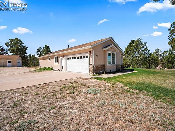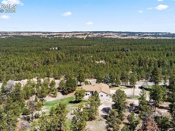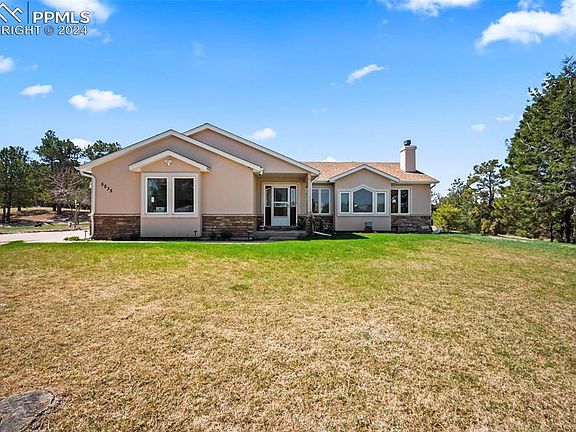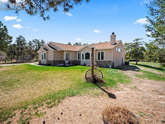 A charming rancher nestled in the tranquil wooded expanse of the Black Forest, updated tastfull with thoughtful designs. Tucked away in the wooded embrace of Black Forest, the rancher enjoys ample privacy, shielded from the hustle and bustle of urban life. The electronic gate entry ensures security and peace of mind, controlling access to the secluded retreat. Crafted with care in 2002, the home reflects meticulous attention to detai. The beautifully updated kitchen and bathrooms add a touch of elegance, blending seamlessly with the rustic charm of the surroundings. The main level boasts a harmonious flow, featuring a well-appointed kitchen, a cozy dining room, a living room adorned with a stone fireplace, a functional office space with elegant built-ins, and a master bedroom along with a secondary bedroom complete with a full bath. Descending to the basement reveals further possibilities, with a spacious third bedroom and a second full bath. The large rec area offers endless opportunities for customization and personalization. Aside from the attached 2 car garage, there is a large detached garage providing ample space for vehicles, storage, and perhaps even a workshop for the hobbies. Despite its seclusion, the rancher is conveniently located near essential amenities such as fire stations, trails for outdoor enthusiasts, schools for families, and hospitals for peace of mind.