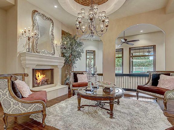 Exquisite! The finest attention to detail & lavish upgrades accent this absolutely stunning 5928 sq/ft ranch is nestled on a .64 acre lot in sought after Carriage Ridge neighborhood backing to open green space w/ miles of walking trails right out your door! Enjoy the white rail fences & tranquil country setting! Enter the grand entry & drawn to the stunning great rm accented by elegant white work, 12ft clg, custom drywall detail, beautiful frplc & hardwood flrs that also grace the beautiful formal dining rm! The gourmet kitchen features top of the line sub zero &Wolf applcs and opens to a impressive covered courtyard /outdoor kitchen, bar &fire pit! Romantic Master w/ fireplace & Luxurious bath w/gorgeous tub that will leave you speechless! Enjoy the LL Theater rm & Fmly rm w/ wet bar!