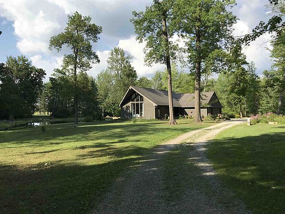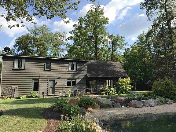 Quiet and Private ! 5 acre country estate with fabulous pond and beautiful home design by Roy McNett. Vaulted great room with large windows, open loft, 3 large BR/2.5BA and 3 car garage. Enjoy the gorgeous view, large rooms and upgrades galore - the remodeled master bath ($30k) has carrera marble and travertine floors with nickel fixtures. All real wood trim and doors. Cedar siding, great insulation.Great location with lots of privacy and quiet. So much to enjoy here- professional landscaping.Walking trails in woods. Enjoy your own park and gracious comfortable home. Home has Generac back up generator. 1000 gal owned LP tank. Pond approx. 9' deep in deepest. Extra well for pond use. Main well is 4". New tear off roof being installed 8.20.20. This home has great curb appeal. Do not miss it.