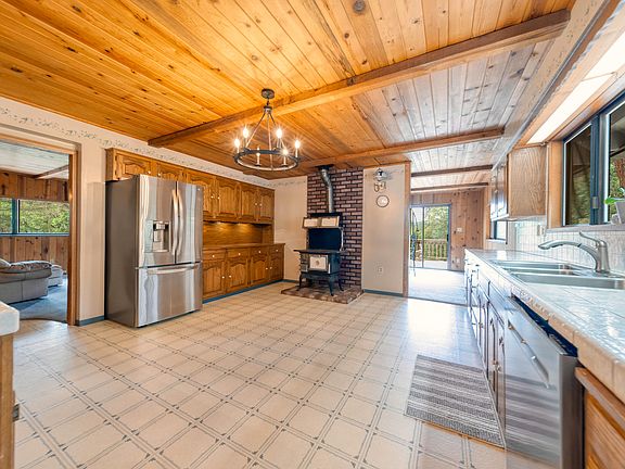 What a setting! First time on the market. Fabulous country family home on 5.05 treed acres-over 3600 square foot could easily be a 2 family set up with complete apartment downstairs with separate entrance. Great well, fenced garden area and tons of parking (covered) for RV and/or boat. Separate oversized 2 car garage with shop area. This property has it all going on! The home itself is tucked back off the road with big wrap around decking and covered patio to the rear. The main living room has lots of wood and has a comfortable homey feeling. The kitchen is spacious with lots of storage and is also a ''eat in'' kitchen. Dining area. Master is on the main level and has a separate entrance. Lots of trees with just the right amount of light peaking through......close to services.