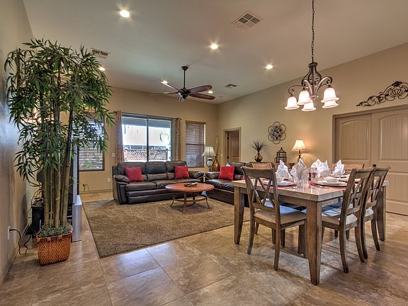 Lovely, modern, fully-furnished, 3 bedroom 2.5 bath home in East Mesa at the Apache Wells retirement village (McKellips and Recker). There are two, double-sink, master bedrooms plus an additional guest bedroom. Utilities and wireless Internet provided. Tenant pays television portion of Cox bill. The home has a 2 1/2 car garage. Short term availability: now until October 25, 2018. Daily, weekly and monthly rates available. Rate set according to length of lease. Invite your friends or have a stay-cation there yourself! This is a great neighborhood for retirees! Amenities include golf, heated pool, pickle ball, gym and many other activities! Home is ideal for transitional housing if you are moving or just a relaxing time away from home. Owner pays water and sewer. Internet and wi-fi is also provided. One person must be 55+. Weekly and daily rates available.