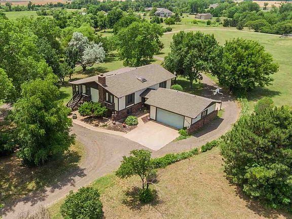 Pilots, your dream country oasis awaits! Located just 1 mile South and 1/2 mile East of Lake Afton on over 7 acres, this very well maintained split level home features a large pond, private runway access, and the opportunity to enjoy rural Kansas living at its finest. Just imagine the possibilities of having your own 2000 ft. runway at your door step. When you are done flying, come home to your large 10 x 46 sunroom or private dock with sweeping views of the beautiful pond, mature trees, and picturesque Kansas country side. Upstairs the spacious interior features a huge master suite with two walk-in closets, an en-suite bathroom, and sun room access as well as a living room, kitchen, and dining room with additional access to the sun room. On the lower level, you will find a large family room featuring a wood stove, wet bar, patio access, bathroom, laundry, and two oversized bedrooms. Detached two car garage and storage sheds round out this amazing property.