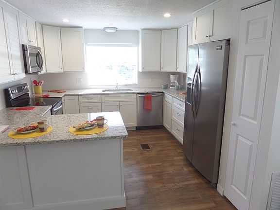 This spacious totally remodeled home has new roof with lifetime warranty, new plumbing, wiring and outlets are new. Granite counters in kitchen and baths, new stainless steel appliances, New sub-floors throughout, New doors, trim, and crown molding. Located close to clubhouse on a quiet cul-de-sac. This is in a wonderful 55+ community. Features Include: New Stainless Steel Appliances, Extra Large Storage Shed, New Roof with Lifetime Warranty, Located on Quiet Cul-De-Sac, Carpet, Carport, Ceiling Fan(s), Central A/C, Dish Washer, Disposal, Lanai, Land Lease, Microwave, Non-Smoking Owner, Range/Stove, Refrigerator, Roof Over, Shed, Shower, Skylight, Tile Flooring, Tub/Shower Combo, Walk In Closet(s), Window Treatments , Wood Flooring,