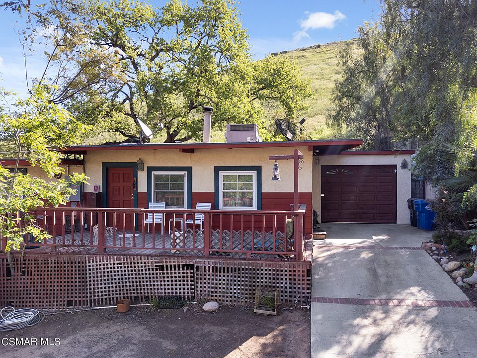 Rare Opportunity awaits the buyer who has vision. Fantastic property that spans 2 levels offering views and serenity as well as having corrals and outbuildings for horses or animals (please check zoning). Sales price includes Lots 5, 6, 7, 8, 21, 22 and 23 (over $16,000 sq ft). Enjoy the afternoon sunsets from your vast porch area. Many small buildings on the property mimic an old western town, one of which is a single car detached garage hiding as a Saloon. The home has warmth and function; a family room with a wood burning stove, small dining area off the kitchen. Second family room or alike, step down into a living room with cozy fireplace (this area was once the 2nd bedroom but was opened up as a living room. The primary bedroom features French doors to the side patio plus another wood burning stove. Enjoy the stars from your bed under your large skylight. All this plus an en-suite bath. There is an additional full bath, forced air heat and central air, a oversized garage and more. Peaceful and tranquil. Room for an ADU or possible SB9 lot split to open many more opportunities. Adjoining fenced in parcels are included, almost 16,000 or so sq ft of property.
