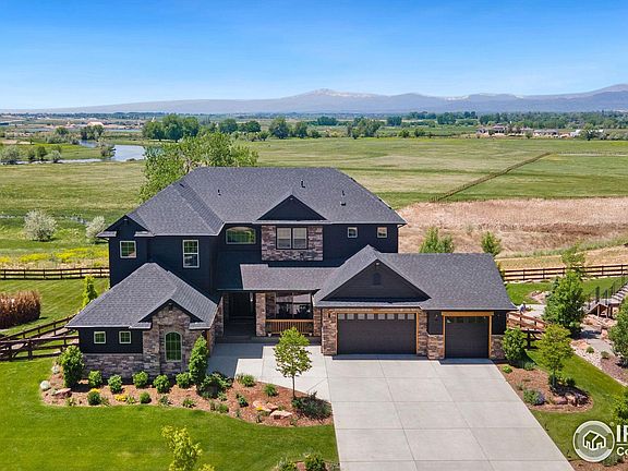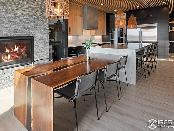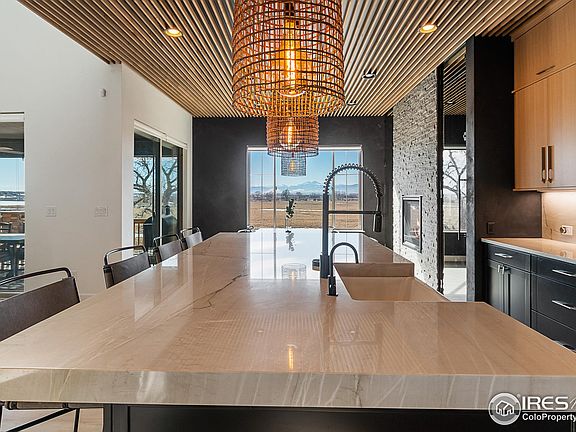 A rare opportunity for a truly one of a kind Scandinavian Modern Custom Home in Summerfield Estates designed with no expense spared. From the breathtaking panoramic views of the Rocky Mountains and Poudre river, to the vaulted ceilings and one-off lighting found throughout, this home will leave you in awe every time you walk in the door. The kitchen is highlighted with new White Oak Slab cabinetry, Luxurious Mitered Bianco Superiori Quartzite waterfall counters extended to a black walnut slab eat-in area in front of the stone fireplace sided by custom glass wine nooks. The meticulous wood slating throughout the kitchen, dining room, and primary bath accentuate the hand selected Scandinavian lighting. An 18' Custom venetian concrete grand fireplace in the living area draws your eyes to the Cloud Concrete pendants creating a warm mood throughout. An 14' sliding glass door leads you out to the spacious covered deck where you can enjoy the mountain views and Longhorn Cattle roaming the pastures below. Further features of the main level include a full Guest or in-law suite, stunning 1/2 bath with 3D tiling, floating vanity and a petrified wood sink, plus a generously sized office/ rec room. The custom glass railing leads you upstairs, across the catwalk where the spectacular views continue in your very own Owners Wing upstairs. No detail was overlooked in the grand bath with hand crafted mirrors, floor to ceiling tile, and a freestanding soaking tub, leading you into your over 400sf split closet. 2 additional generously sized bedrooms are found upstairs, each with their own en-suite bathrooms and walk-in closets. The Walk-Out basement is perfect for spreading out featuring a full wet bar, large rec / entertaining area that leads out to an oversized concrete patio with a hot tub, plus two additional bedrooms.