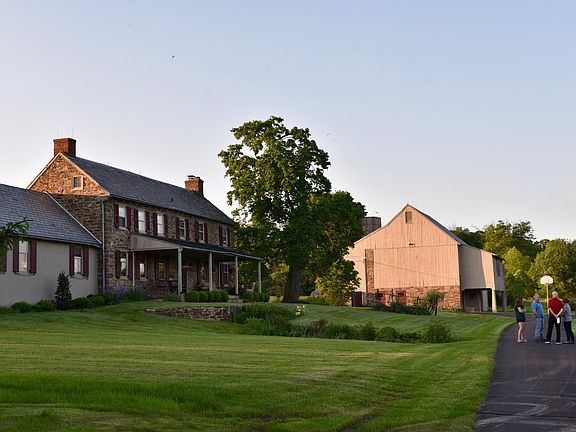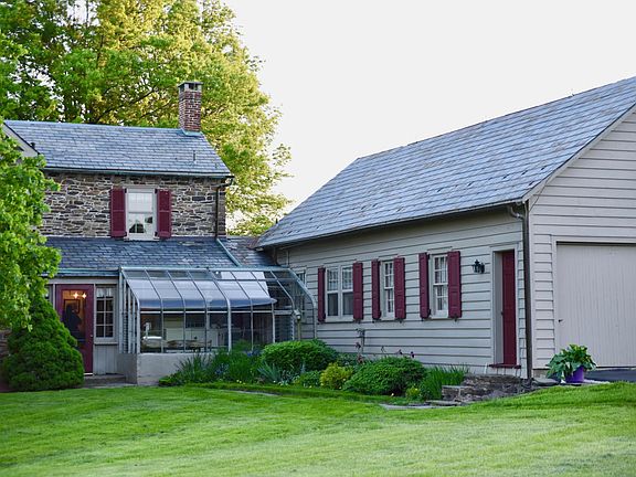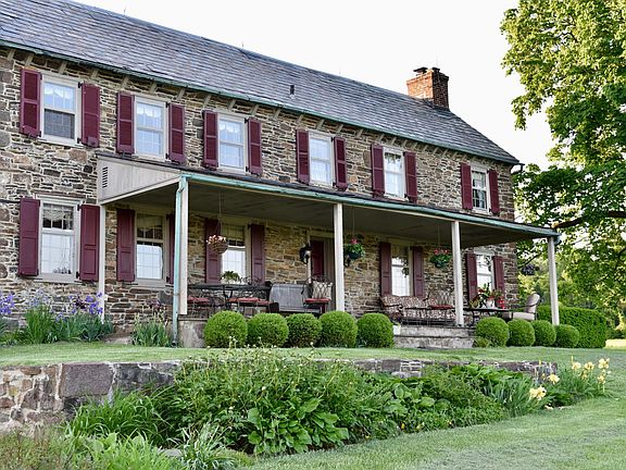 "West Wind Farm" Classic Bucks County stone farmstead situated on 67 acres dating back to the 1830's. High ceilings, tall windows, gorgeous fireplaces, pumpkin pine and pegged oak floors. Country kitchen with large fireplace. Formal dining room, wet bar, walk in closet and powder room. Front covered porch with beautiful views looking out toward property's pond. Family room with bead-board panelling and exposed beam ceiling. Large formal living room with fireplace. Upstairs include a main bedroom suite with fireplace, original wide bead board panelling, walk in closet/dressing area and a full bath with stall shower and updated tile. Two additional bedrooms, a hall bath and a linen closet. The third floor, previously used as a bedroom, has a bathroom. Beautiful pool and tennis court. Attached Guest house perfect for home office, in-law sweet or au-pair can be 2/3 bedroom and has one bath and large kitchen. No subletting permitted. Quiet country road. Perennial gardens. Owner pays for lawn mowing, tenant pays utilities, pool, trash, oil, maintaining garden beds, 50.00/mo. per pet fee 1st months rent, last months rent & Security deposit required to move in Also available for additional rent Large Bank Barn, Chicken Coops and other storage or livestock/horse areas