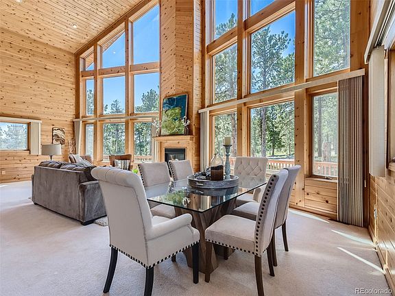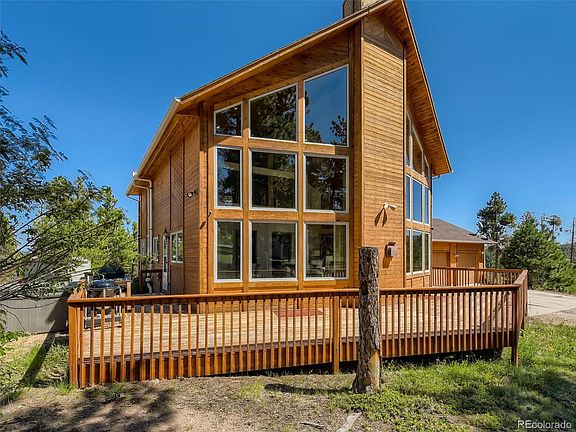 Welcome to this serene cedar mountain home in the foothills of Golden. Driving just 15 minutes up Coal Creek Canyon Road off of SH-93 can take you to this private location, without a difficult or long commute. A community-maintained road will take you to this mountain retreat, resting on almost five acres of pine forest. Enter the home from the main entrance, or directly from the garage, handy during the snowy months. Once you walk in, you'll have immediate access to the mud/laundry room. You'll follow the hallway to a pine-wall bedroom, which can also be used as a home office. Enjoy the stunning views of the pine forest through southern facing floor-to-ceiling windows while resting in front of the gas fireplace in the great room, or while preparing meals in the kitchen using the updated appliances. During the warmer months, you can spend lots of time entertaining on the spacious newly-stained deck, and in the colder months you can enjoy the well-maintained hot tub. This home boasts a large primary bedroom suite on the third floor, accompanied by a double vanity sink bathroom. Once you make your way to the basement, you'll find yourself in large TV room complete with a wet bar. Down the hall are two additional bedrooms and a full bathroom. Zoned for horses and already has a dog-run built in. Garage space is not lacking with this 3 car garage! The hearts of Boulder and Golden are within a 30 minute drive. Come find your new, peaceful mountain home right here at 584 Crescent Lake Rd.