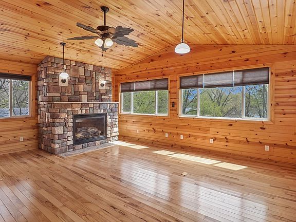 ESCAPE to the RUSTIC CHARM and MODERN UPDATES in this UNIQUE COTTAGE Home. KNOTTY PINE covers vaulted ceilings and walls, BEAUTIFUL HICKORY FLOORS and BUILT-IN SPEAKER SYSTEM throughout! Main floor bath is elegant and modern with a walk-in tile shower and a massage whirlpool tub. Great room has a stone surround gas fireplace and large windows that overlook the PEACEFUL LAKE! The functional kitchen has a built-in stovetop, oven, disposal, micro-hood, 2 sinks and offers plenty of storage and workspace. The large loft has built in shelves and cabinets and could easily be used as another bedroom. In 2010 the owners stripped the house down to the studs: New plumbing, new electric, new OSB, siding and stone, insulation and roof and custom finished the interior. Exterior has rear tiered patios, a large shed, and is just a stones throw to the water. Deeded lake Access, so bring your fishing gear, and water toys!!