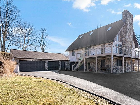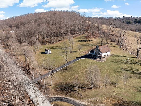 Stunning 20-Acre Property With Hilltop Home and Breathtaking Views! Welcome to your dream retreat! This beautiful home sits atop 20 acres of serene wooded country side, offering privacy, space and stunning views. The moment you step inside you will be captivated by the soaring cathedral ceilings, floor to ceiling wood burning fireplace, and wall of windows, that flood the open-concept living, dining and kitchen areas with natural light. The upper-level master is a true sanctuary, offering a soaking tub, double vanities, shower, and ample closet space. Two bedrooms are located on the main level and each floor convenietly offers a full bath, perfect for family or guests. The finished lower level offers additional living space and features a gas fireplace. The property includes an attached 2-car garage and a detached 3-car garage. This unique property combines modern comfort with the beauty of nature. Close to I-70, I-79. Don't miss this rare opportunity!