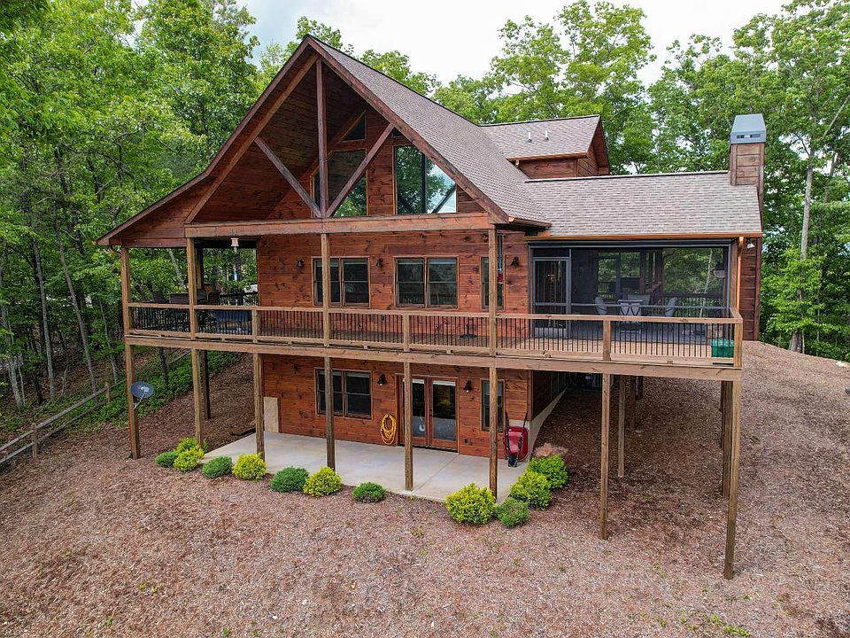 Bop to the top... Bringing new meaning to "high expectations," this stunning rustic chalet showcases the best in mtn living. This year-round mountain view is brought to you from atop Stanley Ridge & can be enjoyed both outside from your screened-in party porch complete w/ fireplace & inside through the wall of glass that is the focal point of the open kitchen & living room. Talk about wow factor! This plan offers 3BR/3BA (1BR/1BA on each level) 2 of those being masters - 1 on the main level & 1upstairs. This home offers stunning upgraded finishes throughout - custom tile showers, wood & tile floors, & more. You'll also appreciate the rec/media room in the bsmt complete w/ bar & fireplace, as well as the carport. Not only are the features of the home & view worth mentioning, but the local amenities are worth taking a look at, too! You're just miles from Lake Blue Ridge, the Toccoa River, & all the other well-kept secrets in this stunning town! Quality craftsmanship that you & yours will appreciate for years to come...