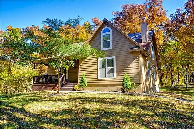 Come and see this SECLUDED 4 bed/4 bath home on nearly 10 AMAZING acres just down the highway from the KC Metro!! Enjoy the privacy of this perfectly placed home, surrounded by all that the outdoors has to offer. Mature trees fill the property, with so much character. Creek (currently dry) winds throughout, with several acres fenced and ready for your horses or other animals! Enjoy evenings on the front porch swing, or morning coffee on the covered back deck. Back yard is filled with mature trees with tall canopies, ready for your fall party around the fire pit. Home offers open concept main floor perfect for entertaining with awesome gas fireplace set in custom stone surround. Master on the main level with 2nd bedroom/office, or larger master suite on second level with loft! Finished basement includes wet bar, entertainment area, wood burning stove, and 4th bedroom with full connected bath. Oversized garage or barn with loft perfect for storing all your farm toys. Fresh coat of paint on exterior....home is ready for new owner!