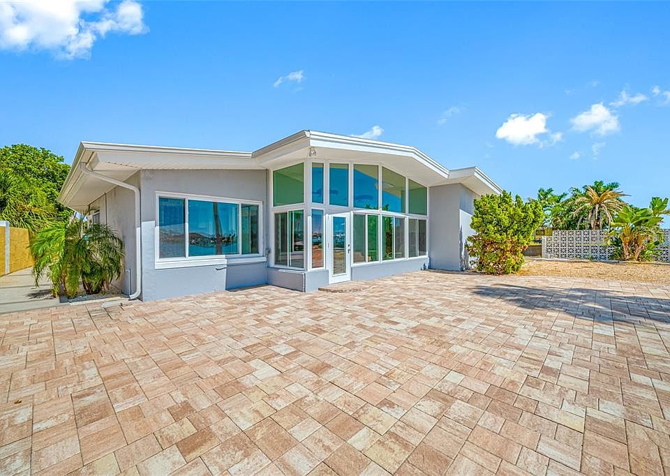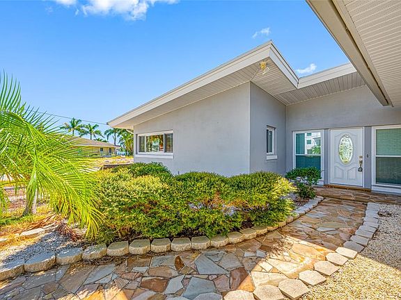 Under contract-accepting backup offers. Nestled on a prime stretch of St. Pete Beach, this 3-bedroom, 3-bath Mid Century Modern waterfront residence offers 100 feet of direct water frontage with a wide southwestern exposure, ensuring stunning sunsets and expansive water vistas. A generous driveway and attached garage provide ample parking and storage, while the home’s design invites easy indoor-outdoor living. Welcoming open floor-plan and an amazing bonus Florida.Sun room with expansive view all around. Large paved waterfront patio with lots of room to entertain Family and Friends. Professionally remediated after Hurricane Helene, it’s a pristine clean canvas, ready for its new owner to personalize with their decorating vision. The property sits on a quiet cul-de-sac in coveted Bahia Shores. With no Homeowners Association, you’ll enjoy more freedom to shape the home to your taste. Monthly rentals are permitted, presenting an appealing option for investors or a flexible use plan. The home sits on a secluded cul-de-sac, enhancing serenity while still being just a short walk to the sandy shore of pristine St Pete Beach. enjoy proximity to unique restaurants, boutique shops, and waterfront amenities, with effortless access to the Pinellas Bayway, downtown St. Pete, and all the regional attractions of the Tampa Bay area. Embrace the Florida tropical beach lifestyle here, where daily sunsets over the water and a coastal breeze define modern coastal living. Make this your full time Tropical Paradise or use it as an incredible opportunity to create rental income. Come join the Florida lifestyle today.