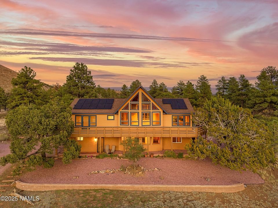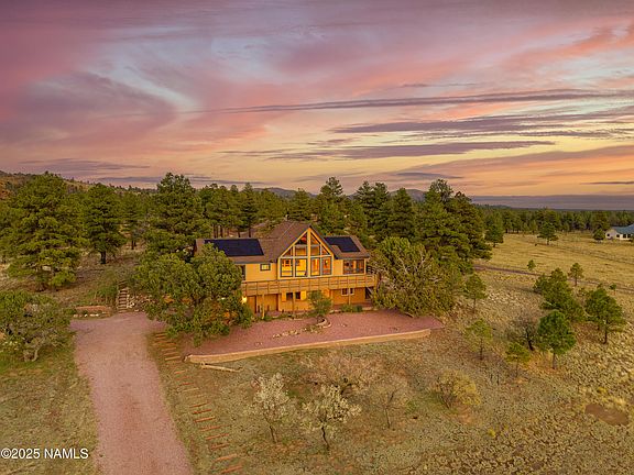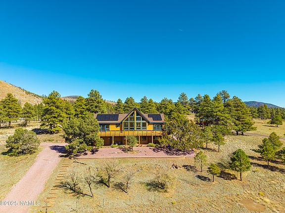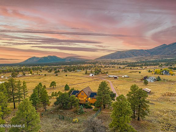 Perched atop a serene hill, on 5 acres backing National Forest, surrounded by Flagstaff's most breathtaking natural beauty, 5840 Waki Road captures the essence of mountain living. With one-of-a-kind panoramic views of Mount Elden and the San Francisco Peaks, every sunrise and sunset in this custom A-Frame feels like a private showing of nature's grandeur. You will love the open, light-filled spaces, 2 living areas, and walls of windows framing dramatic mountain views. The greatroom soars with vaulted ceilings, creating an inspiring space for gathering, relaxing, and taking in the ever-changing scenery. The loft is a sanctuary, perfect as an additional living space or an office. The kitchen has endless counters and a breakfast nook with panoramic views. Gather, cook, enjoy! A flex room adjacent to the primary is a peaceful setting to work, ohm, or to use as a nursery.