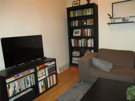 Two bedroom home with formal Living Room, long combination DR and Kitchen. Small, shared outside are in rear. Sleeping floor also contains the full bath. Convenient nook for a home office or reading area. Central air, Gas/forced air furnace. Washer and dryer in the long basement. Central location, great walkability scale Street parking for high availability in my experience.