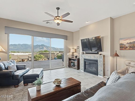 Don't miss this incredible opportunity to own a gorgeous home with stunning views of the Santa Rita Mountains! Located in a quiet well-maintained 55+ neighborhood that's close to the golf club, restaurant and the newest GVR center. Nice open floorplan with an inviting layout that allows you to enjoy the mountain views from inside and outside. Features include 2 bedroom suites, a den, living room with a tiled fireplace and tasteful finishing touches throughout. Kitchen with granite countertops, new gas range, new refrigerator, microwave, dishwasher, R/O system, pantry closet and counter seating. Primary suite has a private door to the back patio, 2 closets, linen closet, a custom tiled shower and dual vanities. Upgraded lighting, ceiling fans, water softener, laundry room with cabinets and utility sink. Spacious garage with epoxy floor and ceiling mounted storage rack. Exterior features include copper-look garage doors and a custom wrought iron security door for added style and peace of mind. Back patio with ample space...perfect for relaxing, entertaining or just taking in THOSE VIEWS. The HOA takes care of front and side yard maintenance, exterior paint, roof recoat & replacement, offering true low-maintenance living. Residents enjoy access to all 13 GVR centers with pools, fitness facilities, pickleball and sports courts, clubs, classes, social activities and much more. This home offers an ideal blend of style, comfort, beauty, and a great lifestyle!