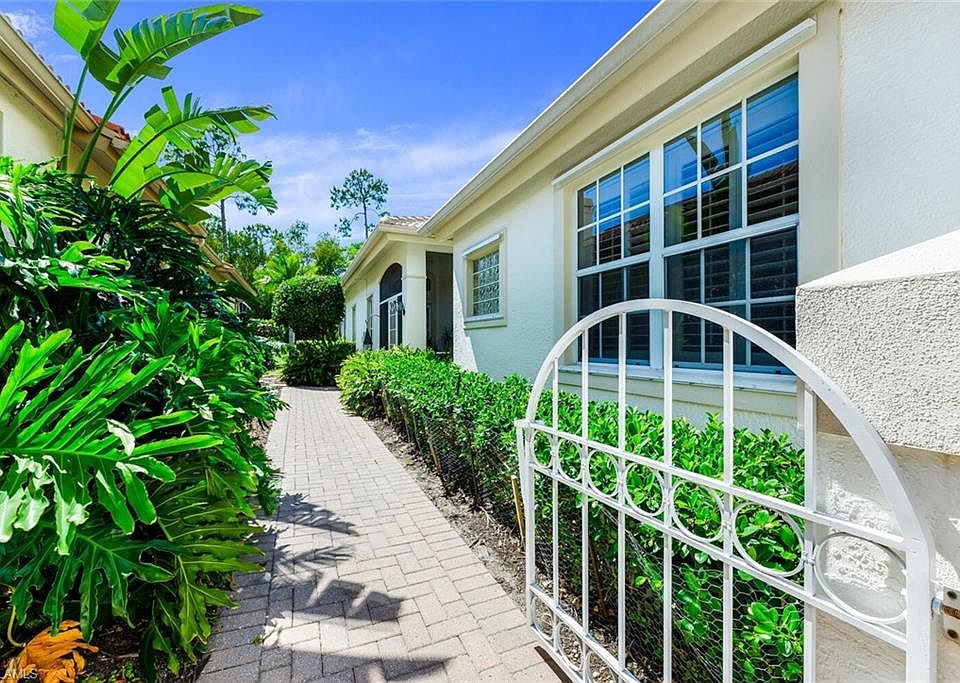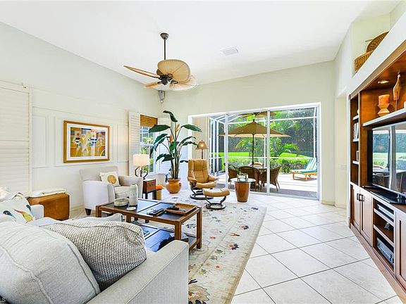 V5744 - Rarely available single story detached villa home, boasting a 3 year old roof, high ceilings, and spacious open living spaces. This very private residence offers an extended outdoor lanai area with a backdrop of trees and greenspace with no neighboring homes directly behind the property. The kitchen is spacious and bright with a convenient center island which makes meal preparations a pleasant experience. The very private main suite offers a charming outdoor courtyard space accessible from the owners bedroom. A tasteful neutral decor is evident as you tour the home. The garage offers a highly desirable golf cart garage bay entrance which is separate from the two car attached garage. Enjoy a friendly, active country club lifestyle, complete with three beautifully maintained 9 hole golf courses, tennis, pickleball, fitness center, and an impressive Jr. Olympic pool with lap lanes. There are newer bocce courts, as well as a recently added croquet center and Island bar for residents to enjoy. All of this is located within short drive of many dining and shopping conveniences, Seed To Table grocery store, and the famous sugar-sand Naples beaches on the Gulf.