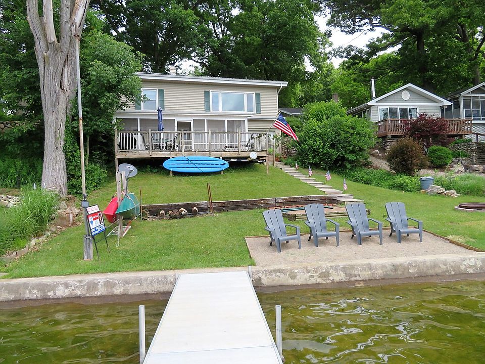 Charming lake cottage on all sports Clear Lake, 240 acres. Beautiful lake view and 50' sandy beach with cement seawall. Ranch walkout for maximum living area, 1 1/2 car detached garage (18x22), paved driveway and extra deep lot with plenty of parking area. Home features 2 large bedrooms and full bath on the main level, large eat in kitchen and nice sized living room. Walkout level has a huge family room, additional bedroom and office plus another full bath and laundry area. Enclosed screen porch is 10x24 plus a 10x24 deck lakeside. So many places to entertain, relax and enjoy lakefront living. Metal roof, vinyl siding, replacement windows, newer laminate floors, hardwood floors and updated electric.