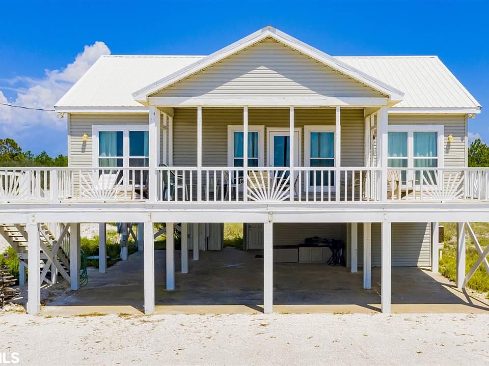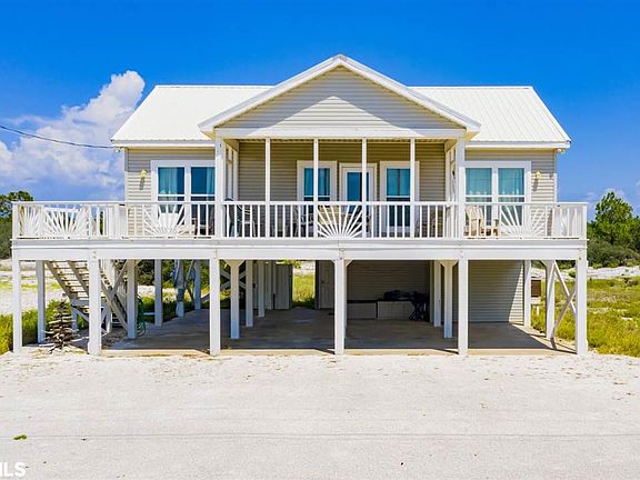 Wonderful Beach House on the Gulf coast in the prime Fort Morgan subdivision of Ponce De Leon Court. This beautifully built beach style home is ready for an individual or family looking for tranquility and peace with spectacular views of the Gulf of Mexico. Two bedroom, two bathroom, fully furnished open concept floor plan that is perfect for entertaining guests as the living, kitchen and dining areas flow seamlessly. This lovely home has a spacious master suite with a walk-in closet, jacuzzi tub, separate shower, tile flooring and bright natural light. When entering the home you will notice expansive breathtaking views throughout and a large covered balcony that overlooks the sandy white beaches - perfect for relaxing and watching beautiful sunsets. Other amenities include interior stairs from the carport, outdoor shower, high ceilings throughout, recess lighting, bar seating, a large storage room, potential for a full bathroom downstairs and new storm doors and windows installed March 2019. With just a short walk to the beach and gorgeous views this home has a great rental investment opportunity. Don't miss out on this excellent and rare chance to own a beautiful piece of paradise!