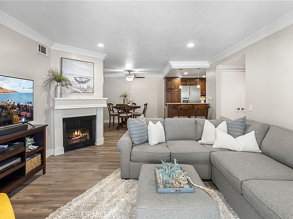 This spacious Main Floor level unit features 2 bedroom, 2 bath condo offers a comfortable and stylish living space. Upon entering, you'll be greeted by a open-concept layout that seamlessly connects the living room, dining room area and kitchen. The living room is bathed in natural light streaming through the slider door, crating warm and inviting atmosphere, recess lighting & crown molding fireplace. It provided ample space for relaxation and entertaining guest, with enough room for cozy seating arrangement and media center. the kitchen features granite counter tops, stainless steel appliances, and plenty of cabinet storage, spice cabinet and pull out pantry drawers, lazy Susan. The two well-appointed bedroom each offering a peaceful retreat after a long day. The Primary bedroom is generously sized and features an ensuite bathroom and large size walk-in closet. The secondary bedroom is equally spacious and offers flexibility for use as a guest room, home office or personal gym. Highlights of this condo include vinyl flooring through out, a private patio with epoxy flooring, ceiling fans, perfect for enjoying your morning coffee as well as in-unit laundry facilities for added convenience. Residents of this community can also take advantage of the amenities, such as the swimming pool / spa, the community center, Easy access to shopping centers, restaurant dining & fwy. access.