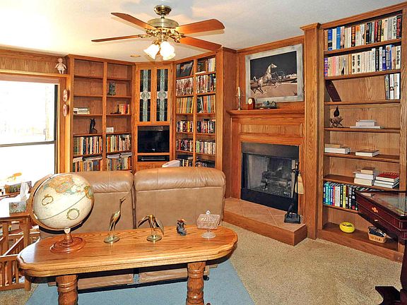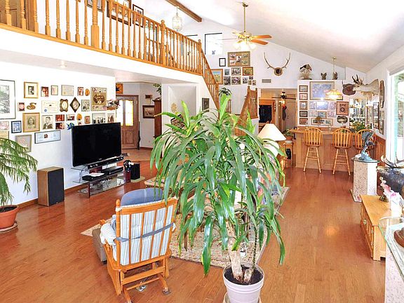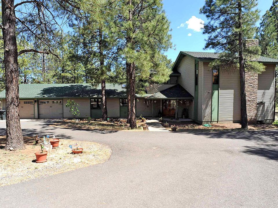 This beautiful, custom home is nestled among the Ponderosa Pines on 7.35 acres! The living room boasts of fantastic picture windows to enjoy the forest views while cozied up by the stone fireplace. The wet bar and wood panel accents and warm hardwood flooring complete the great room. A chef's kitchen features a large island with Corian countertops, breakfast bar, double oven, walk-in pantry and two dishwashers with a large skylight. The private master suite has a luxurious bathroom with a large tub, shower, and dual sinks with his and hers walk-in closets. The library is a craftsman's delight with custom wood paneling, fireplace and built in bookshelves. Conveniently paved driveway, an additional garage/storage shed, and a large deck out the back of the home makes this a must see!