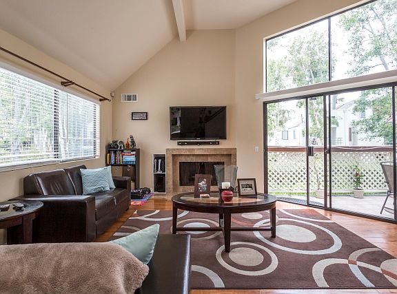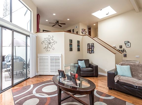 Unique, contemporary and attractive tri-level condo w/end unit location. You will love living & entertaining in this classy yet comfortable condo that conveys SPACIOUSNESS in so many ways: soaring ceilings in the living room w/windows to match, a loft dining room overlooking the liv. room, an expansive master bedroom & bath, a patio or balcony on each level. Beautiful distressed wood flooring thru out, w/Travertine tile in the upgraded kitchen & baths. The kitchen features granite counters & rich wood cabinetry, an eat-in breakfast nook & a pass thru from kitchen to formal dining area. 2 bedrooms & 2 full, upgraded baths. Gas fireplace in liv. room, skylight over stairway, recessed lights, 5 ceiling fans, 2 car direct access garage w/remotes, plenty of storage. The condo has an inside location & backs up to a man-made stream & greenbelt. Enjoy ducks & koi fish & the relaxing sound of the rippling stream right off the patio outside the master bedroom. The pathways through the community are lit for evening walks. There is an assoc. pool & spa. The hiking trails of El Modena Open Space are within walking distance. Standing at the top of the trail, on a clear day you'll be able to see Catalina in the distance. How fortunate for you to call this home!