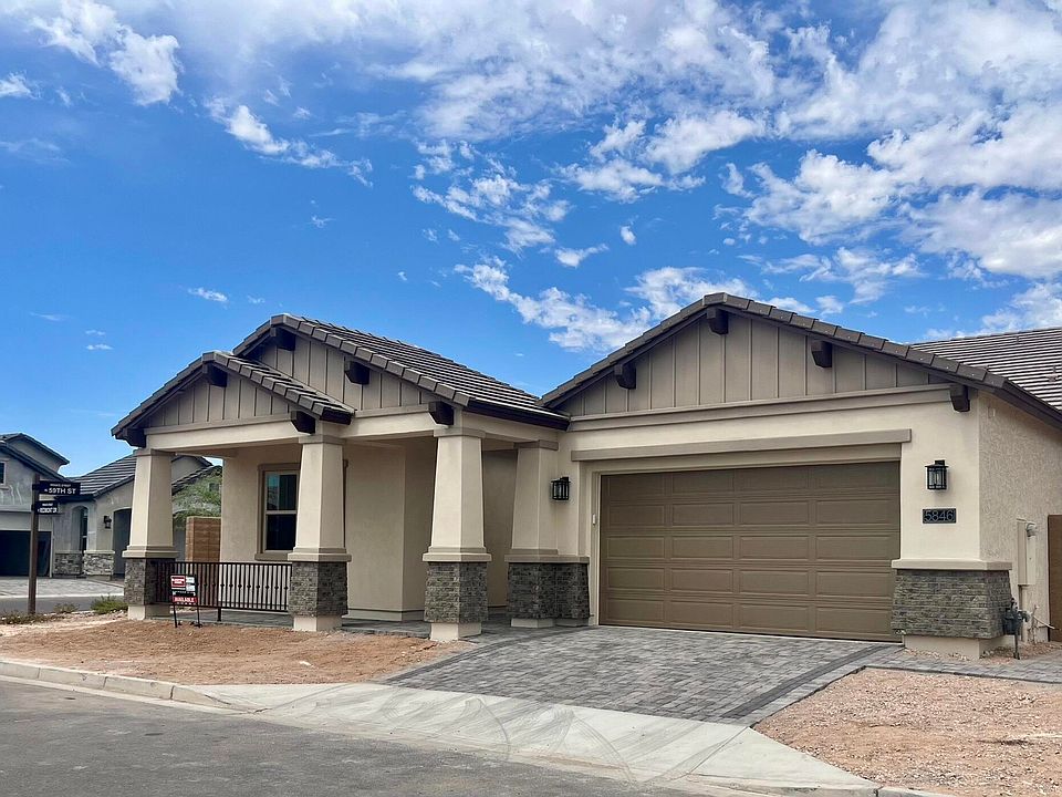 Ready move in home with pretty views, huge green belt behind, mountain views to the East! Single Levels all Around, Corner lot in a great location! Craftsman Style Home with White Cabs, Quartz Countertops, Gas Cooktop and Wall Oven, 10' Ceilings and 8' Doors, Wood-look Tile Whole House, Iron Front Door, 4 Car Tandem Garage! Free Standing Tub and Hugh Shower in Owners Suite. This Special Neighborhood is Selling Quickly and We are Down to Inventory Homes for Quick Move in! Don't miss the Heated Pool, Spa, Party Room, Fitness Center!