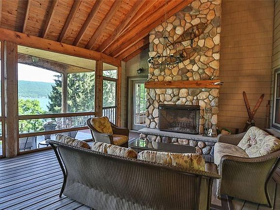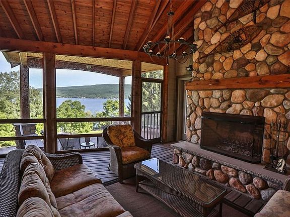 "Maywood Estate"- mint lakefront 3 bedroom 2 bath home with guest house 1 bedroom, 1 bath living room/kitchen connected by large screened room with cathedral ceilings and floor to ceiling stone fireplace. Lake views from every room in house and guest house. Main house has open concept Living Room/Dining Room/Kitchen, beautiful stone fireplace, large screened dining room. Hardwood floors, wood trim, custom shades, laundry, decks. Guest house has open concept Kitchen/Living Room, bedroom, bath, laundry, hardwoods, private from main house. Property consists of 2 parcels: house parcel, separate buildable lakefront parcel with permanent dock, hoist, deck, motorized launching dock. Low maintenance lakefront estate. An additional 21 acres available.