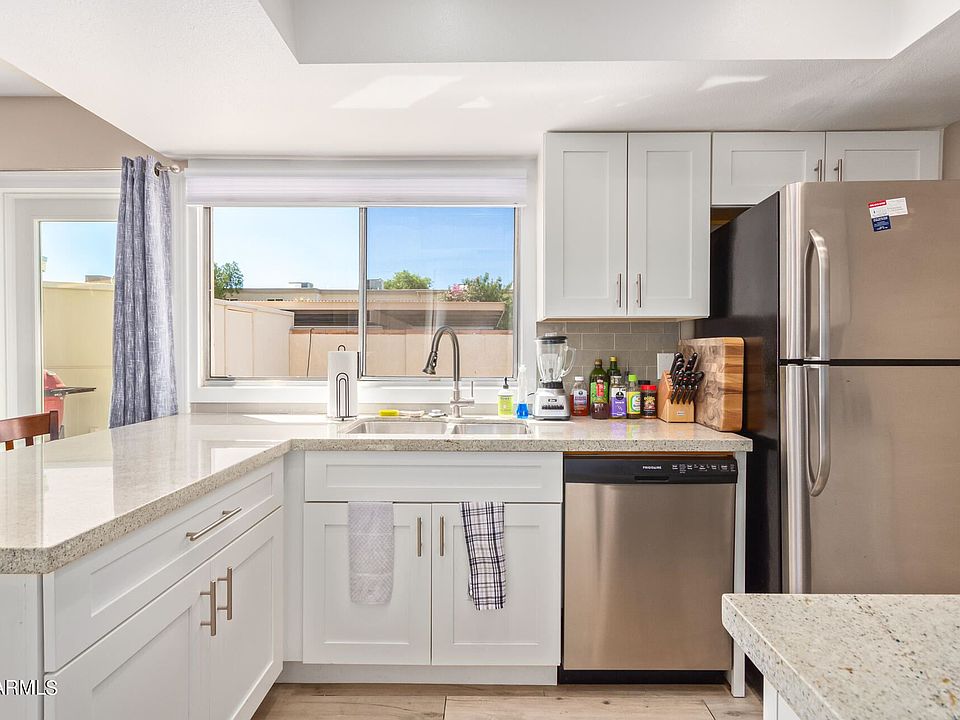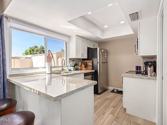 Gorgeous two story townhouse in the desirable Chateau De Vie community! This well maintained unit has tons of natural light in the open common areas with neutral paint throughout and beautiful wood-look tile. The kitchen has granite counters, beautiful cabinetry, stainless steel appliances, a breakfast bar and a pantry. There is a half bath downstairs . The two nice sized bedrooms upstairs both include ceiling fans and his & her spacious closets with a shared full bath in the hallway. Unit has two covered and one uncovered assigned parking spots. The community, amenities include aheated pool & spa, workout facility, and a wonderful clubhouse.