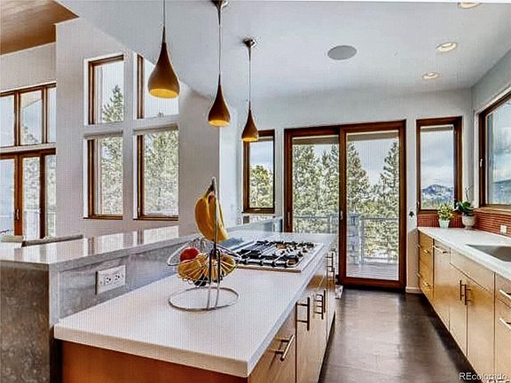 This magnificent mountain contemporary sits on almost 1.5 acres of natural beauty. The beautiful open floor plan has vaulted ceilings, a wall of windows that has views in every direction, luxury vinyl floors and a gas fireplace. The gourmet kitchen features a commercial fridge, 36" gas cooktop, island with quartz waterfall edges, walk-in pantry and bifold windows opening onto a huge wrap-around balcony. You will love the views, tranquility and possibilities for entertaining on this stunning balcony. The sunlit dining room easily opens to the kitchen and great room and features lots of built-ins. Also located on the main floor is the primary suite with a spa like 5-piece bath and walk in closet. Another main floor bedroom makes a perfect office and has double doors onto the back patio. Walk down a lovely floating staircase to the bright lower level with doors leading outside to a maintenance free turf lawn. The large family room has a wet bar and beverage fridge. Two more bedrooms, a bath, bonus room and laundry/mudroom make this a very livable home. The oversized 2 car attached garage has lots of room and the red Huskey shelves, rolling tool box and storage lockers are included. Notable upgrades include a special 2 part osmosis water system, radon mitigation, brand new AC, cellular shades, Pella windows/doors, new tinting on all windows, closed circuit outdoor security system, new blacktop on the driveway, leveled area in upper yard and so much more. Dedicated RV parking and additional parking right off the private drive. Close to all that Evergreen has to offer, and yet so close to the city. High speed internet available through commercial Xfinity account.