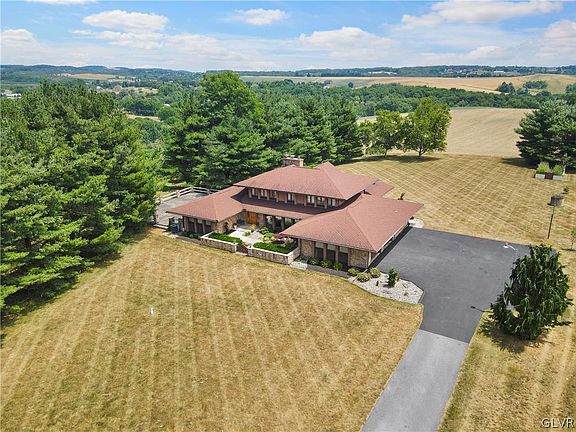 Views abound this beautiful villa-like styled home in a country setting on 8+ acres. As you enter this lovely home through the well manicured courtyard, you encounter a spacious first floor with a combined living room/dining room off the foyer. The family room with a cathedral ceiling and walls of windows with endless beautiful views features random width hardwood floors with nailhead trim, a floor to ceiling stone fireplace with propane as well as plaster walls and ceiling transformed to look like beautiful wood walls and beams. The kitchen has dark cherry cabinets, Italian tile flooring, corian countertops and sink with filtered water and island with an electric 4 burner cooktop with a grill option. The master bedroom with en suite bathroom, a laundry room and a full bath complete the first floor. The 2nd level offers 2 bedrooms, a full bath and a loft area overlooking the family room. The lower level is partially finished with a full kitchen that has Italian tile flooring and ample space to finish the rest to meet the new homeowners needs. Whole house propane generator. There are 4 garages, 2 on the main level of the home and 2 on the lower level. Outdoor entertaining areas feature a covered patio as well as an open 50 x 40 patio overlooking the hillside with beautiful, tranquil views. Make an appointment today to see this home atop a hillside in Northwestern Lehigh.