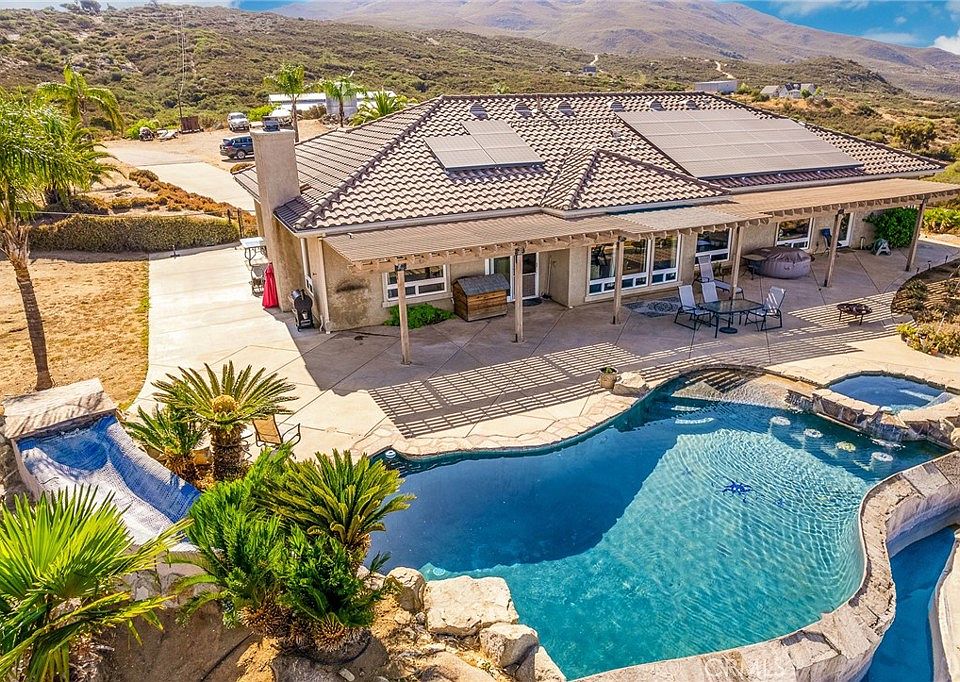 Unbelievable Deal !!! over 40+ acres Beautiful Custom Single Story w large Red Barn , Lot can split ! Solar, should cover , the electric cost on main home from Sdg&e the cost is 0 , But the Lease to Testla solar, is $170 a month, re: the barn and 2 bedroom off barn is on a separate connection, tenant will pay SDG&E not on solar, buyer to take over permitting 2 bedroom off the barn, Custom SINGLE STORY with Beautiful Sparkling Pool, Slide & Spa, Home has water rights, and a well!!! Beautiful Fireplace in the Living room !!! MILLION DOLLAR VIEWS FOREVER !! If you want some Privacy, We have it. ITS SO BEAUTIFUL !!!! It Can be 4 bedroom or 5 bedroom, but sellers made into Art room, and office, just add closets . The Large Barn is permitted . also Seller built a 2 bedroom in the rear of the Barn, Its in prosses of getting permitted. THIS IS A MUST SEE ESTATE , SELLER is painting rear patio cover, Did i say 41+Acres, Seller changed the boundaries lines w the neighbors lot like for like still over 40 acres seller and neighbor share the easement cost of 701.00 a yr to Cleavland national forest