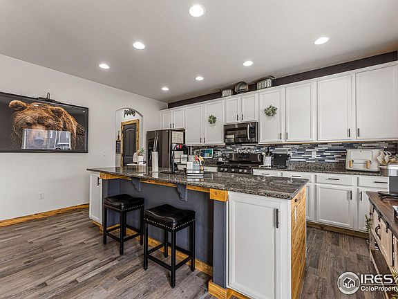 Welcome to your dream home in Heritage Ridge! This stunning 5-bedroom, 4-bathroom home seamlessly combines classic charm with contemporary elegance. Updates include new flooring, new interior/exterior paint, and reclaimed barnwood features. Every detail of this home has been meticulously curated, from the fixtures and hardware to the faucets and ceiling fans-all new and selected for their quality and modern aesthetic. Custom pine beetle and barnwood trim runs throughout the home, adding a completely original touch that sets this property apart. The farmhouse-style kitchen has white cabinets, large island, stainless steel appliances, and a butler pantry with easy access to the formal dining room framed with custom barn doors. Vaulted ceilings and gas fireplace in the living room create an inviting atmosphere. The primary bedroom features cathedral ceilings and a dual-sided fireplace. Also on the upper level, two additional bedrooms, full bathroom, laundry room and cozy loft. The finished basement offers two bedrooms, full bathroom and larger entertainment space. Enjoy the backyard with a spacious deck and fire pit. Location is key, and this home offers amazing location. Situated right next to a pocket park, just down the street from the neighborhood pool and less than a mile from trails, schools, and charming downtown Berthoud. This modern farmhouse is a blend of style, comfort, and functionality. With its thoughtful design elements, quality finishes, and prime location, it is one you can't afford to miss.
