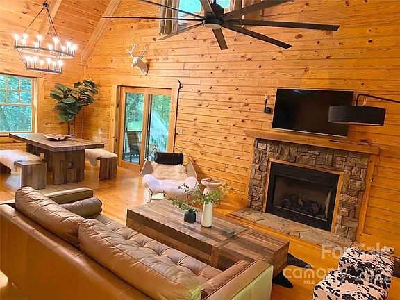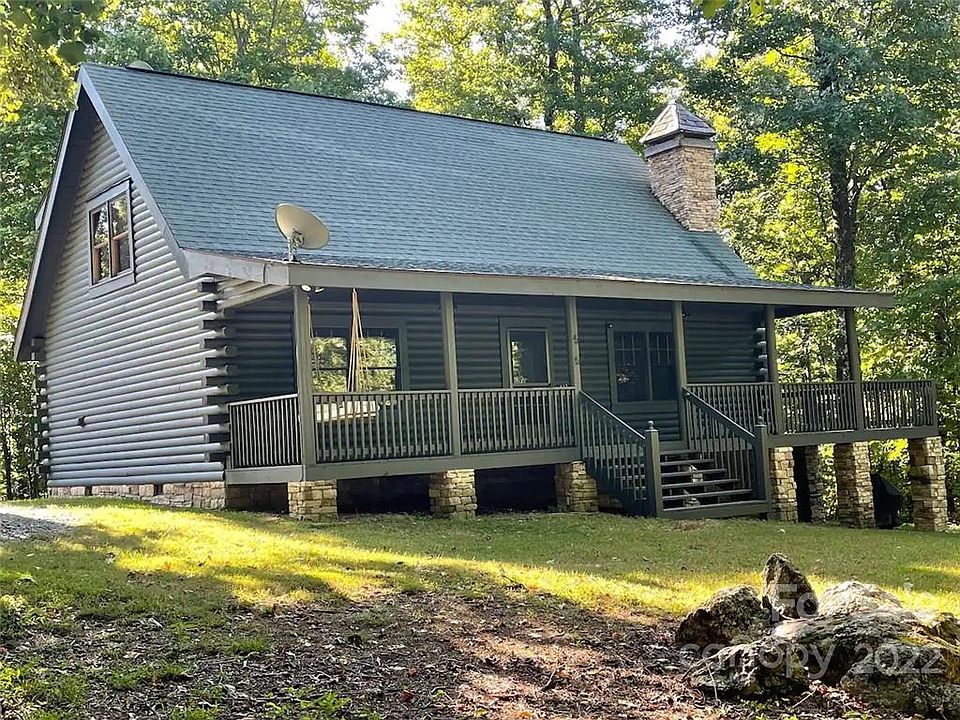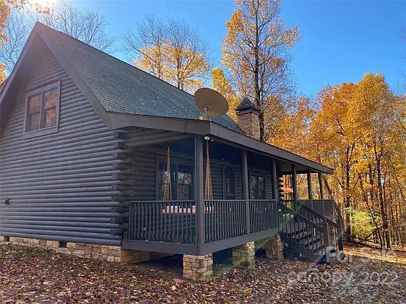 Perfect mountain getaway nestled on 1.32 acres in a small gated mountain community at the top of Bald Mountain in beautiful WNC. Cabin with dramatic 22" ceilings enliven the space while the warm wood logs & stone fireplace create a cozy atmosphere. Open & airy living room connects seamlessly to kitchen. The porches provide additional spaces to relax & unwind amidst nature. Primary bedroom on main floor is adorned with floor to ceiling logs & has a full bath along with a large closet. Hardwood flooring throughout! Kitchen w/ center island offers stone counters, gas range & loads of wood cabinetry. Upstairs is another bedroom & full bath along with a spacious loft offering guests upstairs a cozy sitting area for reading or watching a movie. Large covered porch across the entire front of the home offers a perfect setting. Close to Chimney Rock, Lake Lure, Downtown Black Mountain & Asheville. SHORT TERM RENTALS ARE ALLOWED.