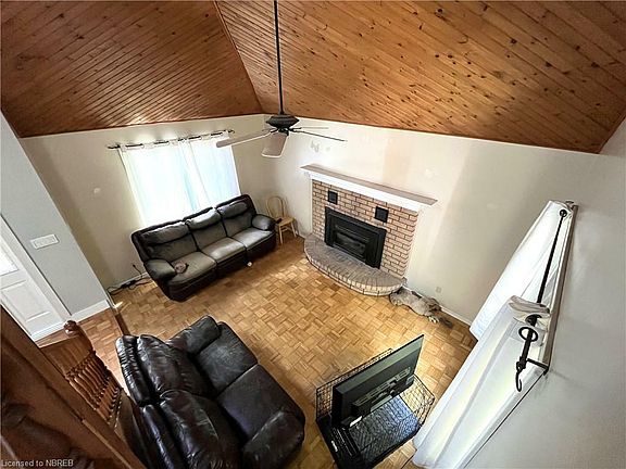 Very spacious 2 story home with over 2100 square feet of living space features 3 large bedrooms on the 2nd floor, including primary bedroom with ensuite bath with jacuzzi tub as well as the main 4pc bath to complete the second level. The main floor has cathedral ceilings in the foyer and living room with gas fireplace, hardwood floors in the very spacious dining room which leads to large 3 season sunroom overlooking the private landscaped backyard. Completing the main floor is a very bright kitchen with tons of counter space, double sinks and center island as well as a 4th bedroom or office and laundry room with 2pce bath. There is Direct access to the heated insulated 25x34 attached garage for the vehicles and all the toys. Other notable features include an updated Forced air natural gas furnace (2022) with central air. Public Lake access located across the street for swimming and snowmobile access and the boat launch is just a minute down the road. Direct access to ATV and snowmobile trails including the OFSC trail system. Land lease with Nipissing Band #10 $3985.00 per year