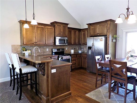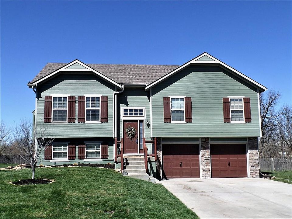 Perfect opportunity to own this Beautiful 4 Bedroom and 3 Bathroom Raymore Home! Meticulously maintained, this property boasts numerous upgrades that are sure to impress. The open layout features vaulted ceilings, lots of light, and freshly painted with modern colors inside and out! Finished lower level features nice size family room and lower level 4th bedroom or office. Quiet area that backs up to green space! Enjoy peaceful evenings off the back deck overlooking nature. Backyard has invisble Dog Fence that stays with Property. Prime location, being in close proximity to major highways, schools, and entertainment hotspots. Hurry and schedule a viewing today to see this ideal Raymore Opportunity! Won't last!