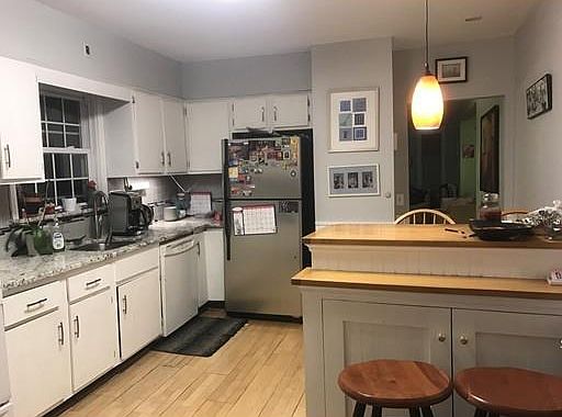 Beautiful 7 room,3 bedroom in a fabulous 2 family.Gorgeous living room with open floor plan!Formal dining room,Lovely large kitchen with lots of cabinets,Island,Granite counter top & Stainless Steal appliances,Fabulous Large NEW bathroom with lovely tile work & double sinks.3 nice size bedrooms on 2nd level.Home office/den.Other features inlude:-hardwood floors,new windows,washer/dryer,Gas heating system,Back deck,large patio with lovely garden area,plus enclosed side yard,3 car parking(1 garage space), pet friendly(smaller dog),on bus line ,close to mass pike&xpress bus.Available March 1st..A gem..
